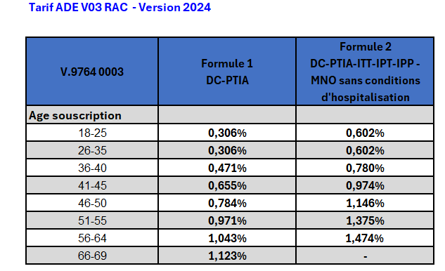 La grille de taux en vigueur depuis 2024 propose une segmentation du tarif en fonction de l’age à l’adhésion.