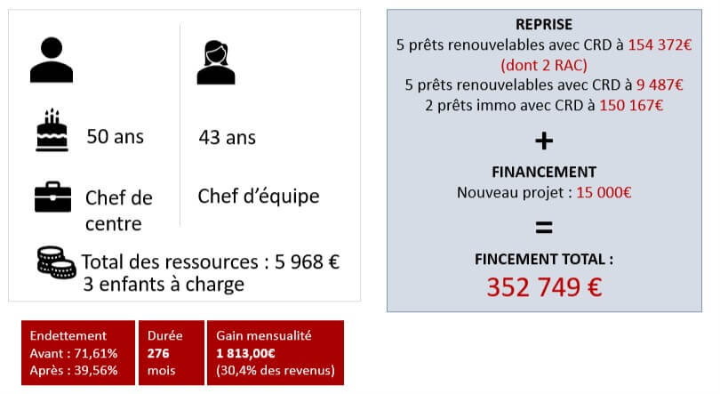 Nous avons racheté l’ensemble des prêts conso en cours ainsi que les crédits renouvelables débloqués récemment dû à leur endettement ainsi que les 2 prêts immobiliers en cours.