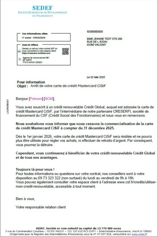 À partir du 1er janvier 2026, l’ensemble des cartes de crédit Mastercard CiSiF sera résilié.