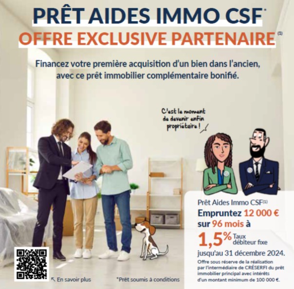 Infos produits Page précédente Fin de commercialisation du prêt « AIDES IMMO CSF » au 31/12/2024 Le prêt « Aides immo CSF » proposé depuis le 1er septembre 2024