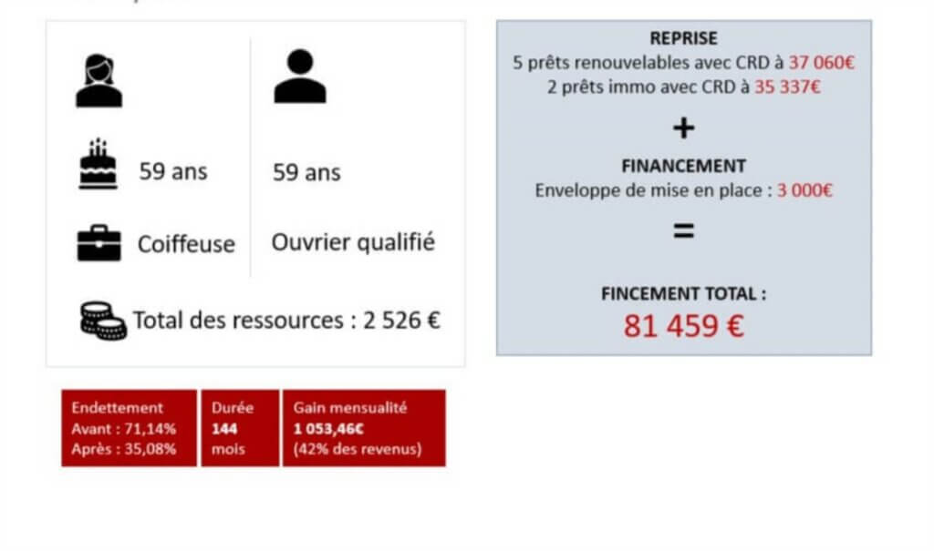Nous avons racheté l’ensemble des prêts conso en cours ainsi que les crédits renouvelables débloqués récemment dû à leur endettement ainsi que les 2 prêts immobiliers en cours.