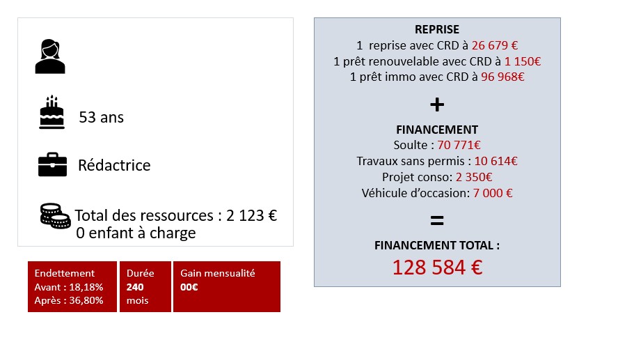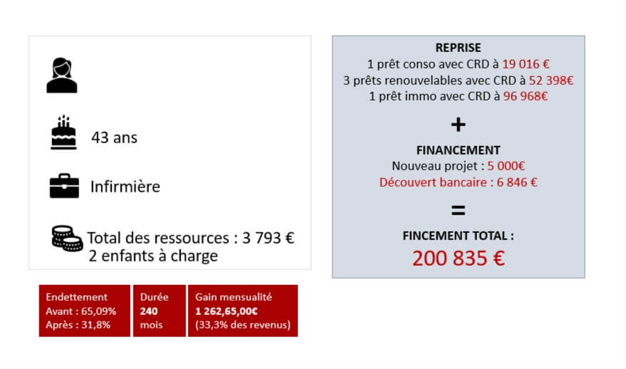 Nous avons racheté l’ensemble des crédits en cours. Nous y avons associé le prêt immo, le découvert et 5 000 € de trésorerie. Grâce à notre intervention, nous avons pu lui apporter un gain mensuel de 1 262 € et baisser son endettement de plus de 50 %.