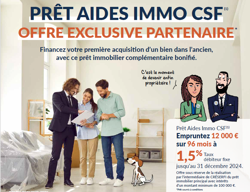 Infos produits Page précédente Fin de commercialisation du prêt « AIDES IMMO CSF » au 31/12/2024 Le prêt « Aides immo CSF » proposé depuis le 1er septembre 2024