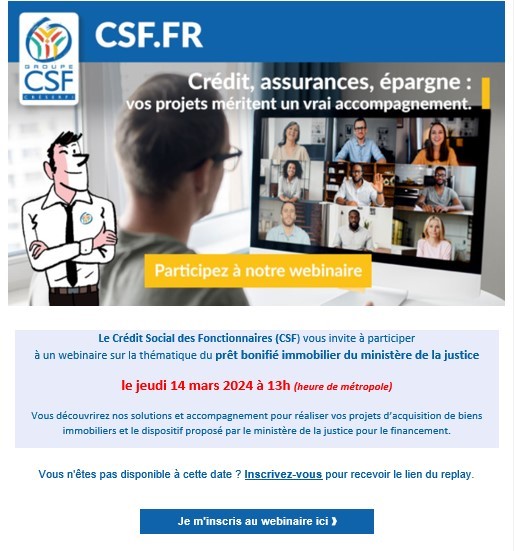 Le 14 mars 2024, des agents du domaine de la Justice ont assisté à un webinaire organisé par le CSF. Cet évènement national exceptionnel présentait le dispositif de prêt bonifié immobilier du ministère de la Justice.