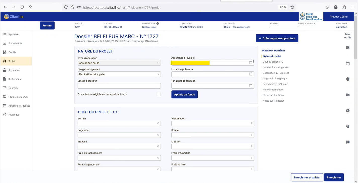 Dans Cifacil, vous devez absolument renseigner le champ Assurance prévue le avec la date d’effet prévisionnelle de l’ADE+ (=date d’effet J@ssure). Ce champ se trouve dans l’onglet Projet. Cette date doit impérativementêtre mise à jour.