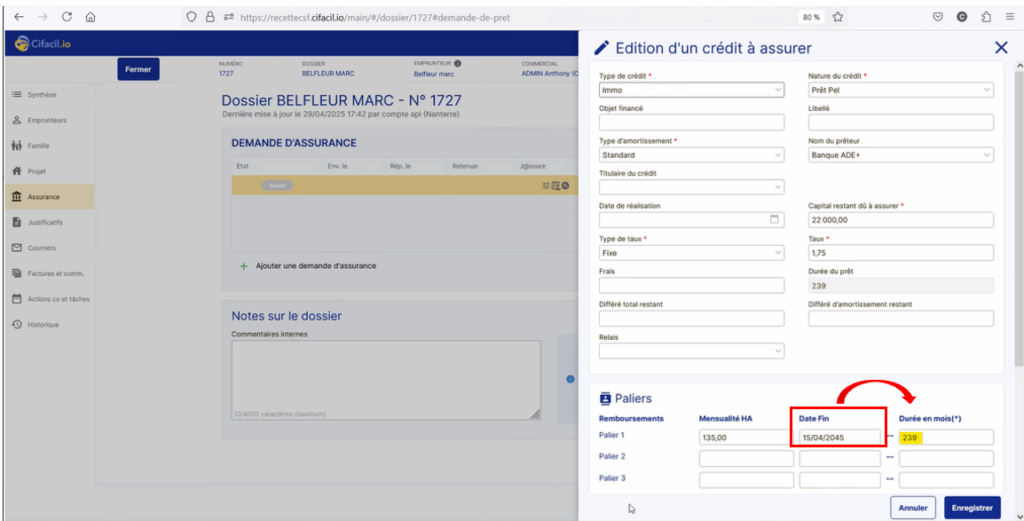 Pour fixerla durée de l'ADE+, il est IMPÉRATIF de renseigner le champ "Assurance prévue le"