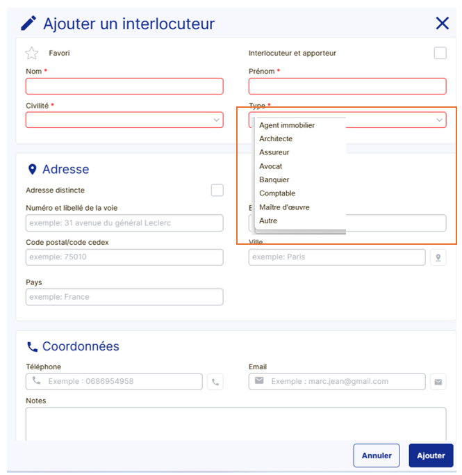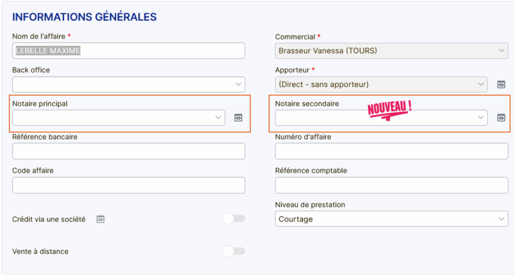NOUVEAU, vous pouvez désormais saisir les coordonnées d’un 2ème notaire. Il est également possible de renseigner les coordonnées de tout autre interlocuteur (Architecte, maître d’œuvre, agent immobilier).