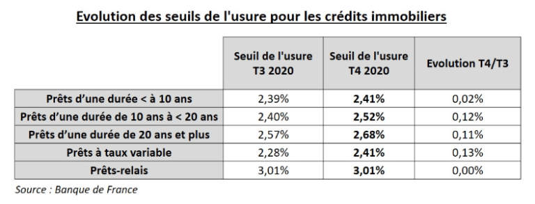 Pour le 4ème trimestre, les taux d’usure ont été rehaussés depuis le 1er octobre. En raison de la hausse des taux immobilier observée cet été – juillet, août et septembre -, ces taux seront réévalués à 2,41 % pour les prêts inférieur à 10 ans et 2,68 % pour les crédits de plus de 20 ans. Soit une hausse de 10 points par rapport au trimestre précédent. Ce relèvement devrait de facto permettre à certains clients dont les dossiers étaient bloqués – notamment ceux qui n’accèdent pas aux meilleurs taux – de pouvoir débloquer leur dossier.