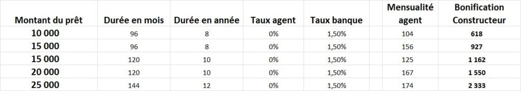 Ci-dessous quelques exemples de montants et de durées possibles ainsi que le coût de ce dispositif bonifié.