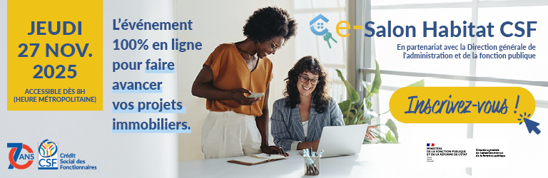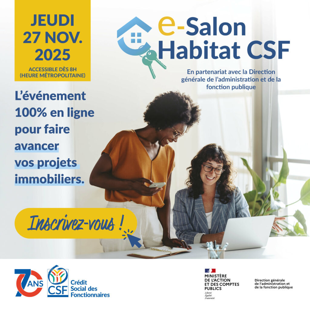 Comme vous le savez, le e-salon Habitat CSF se tiendra le jeudi 27 novembre 2025, de 8h à 23h. Cet événement 100 % digital a été conçu pour accompagner les projets immobiliers des fonctionnaires et assimilés. Une journée unique, accessible depuis un ordinateur, une tablette ou un mobile, pour échanger en direct, assister à des conférences en ligne et rencontrer nos partenaires immobiliers !