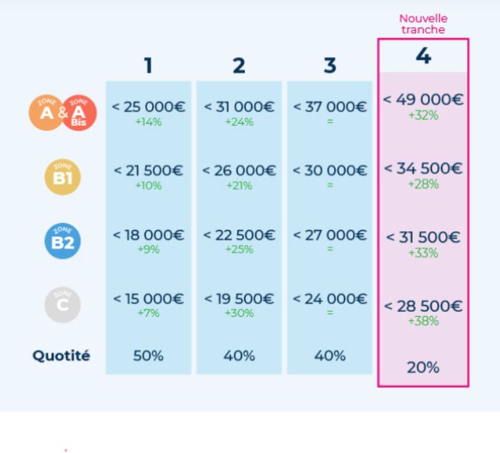 - Augmentation significativement des plafonds pour les deux premières tranches de revenus afin de rendre les prêts accessibles aux ménages. Par exemple, les plafonds de revenus pour la Zone A passeront de 22 000 € à 25 000 €, soit une augmentation de 14%.