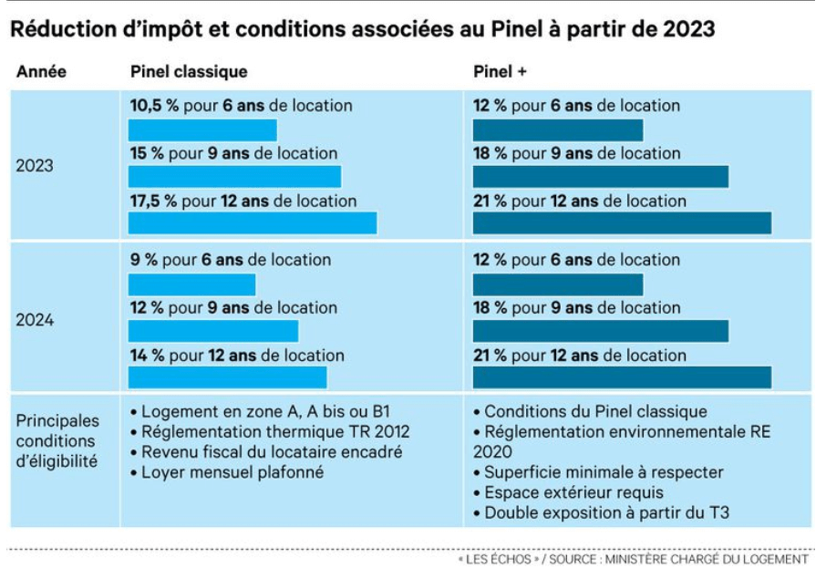 Les taux actuels de réduction d’impôt de 12 %, 18 % et 21 % du coût d’acquisition (en métropole) pour des engagements de location à loyers plafonnés pour respectivement, 6, 9 et 12 ans, devrait ainsi être ramenés en 2023 à 10,5 %, 15 % et 17,5 %. Pour 2024, ce sera 9 %, 12 % et 14 %. Le décret fixant ces nouveaux critères devrait être publié d’ici à la fin de l’année, précise le ministère.