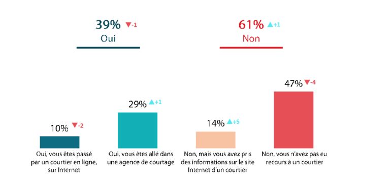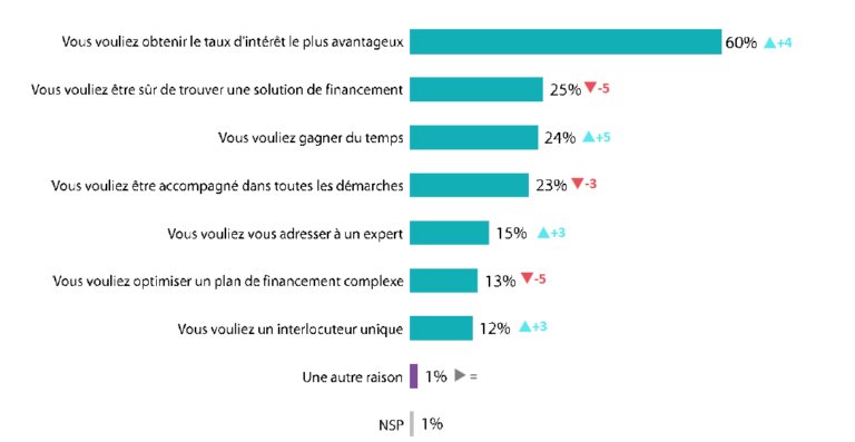 Les Français qui ont recours à un courtier dans le cadre de leur prêt immobilier le font toujours principalement pour des raisons financières : 60 % d’entre eux cherchent à obtenir le taux d’intérêt le plus avantageux, un chiffre en hausse de 4 points sur un an. 25 % veulent être sûrs d’obtenir une solution de financement, contre 30 % il y a un an mais 23 % il y a 2 ans, témoignant que bien que le contexte soit moins contraignant qu’en 2020, les recommandations du HCSF ont tout de même encore un impact. Vient ensuite en 3ème position le fait de gagner du temps (24 %, + 5 points) car en un seul rendez-vous, on peut mettre en concurrence toutes les banques, puis l’accompagnement dans les démarches (23 %, – 3 points).