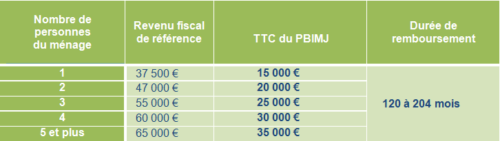 - LE PBIMJ n’est attribué que si la somme des revenus fiscaux annuels de référence de l’ensemble des personnes composant le ménage est inférieure ou égale aux plafonds fixés ci-dessous :