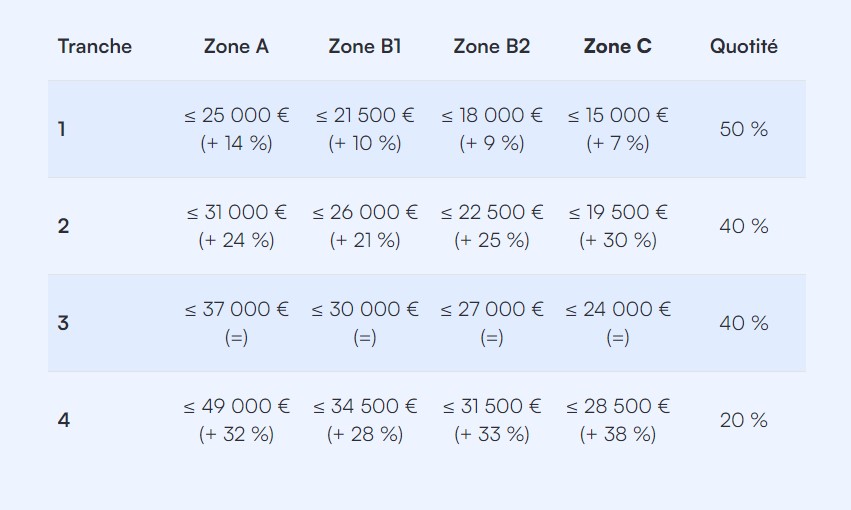 Les barèmes de ressources ont été revus à la hausse afin de prendre en compte l’inflation et d’élargir le nombre de foyers bénéficiaires. Une quatrième tranche (entre 37 000 € et 49 000 €) a en outre été créée afin d’intégrer des ménages plus à l’aise. Le gouvernement estime ainsi que 29 millions de foyers fiscaux seront éligibles au PTZ, contre 23 millions aujourd’hui.
