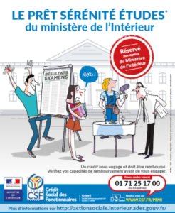 A la demande du ministère de l’Intérieur, ce prêt vient d’être rebaptisé « Prêt Sérénité Etudes », l’occasion de communiquer sur l’accompagnement des agents dans chaque étape de leurs projets de vie. Pour rappel, ce prêt permet une aide au financement des études pour les enfants âgés de 15 à 26 ans, en apprentissage ou en études post BAC et hors enseignement général. Il est proposé à tous les agents du ministère de l’Intérieur: