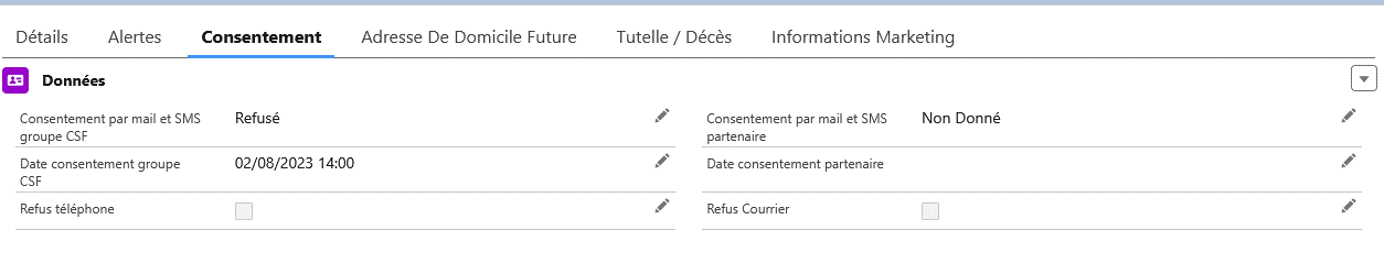- Sur le formulaire du particulier, vous ne pouvez plus choisir la valeur Donné dans les champs Consentement.