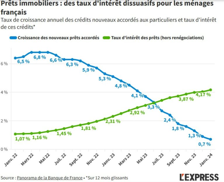 Et ce, alors que les banques n’ont jamais aussi peu prêté depuis 2015, selon le volume annuel cumulé des crédits immobiliers accordés en 2023. Une tendance qui continue aujourd’hui : selon les derniers chiffres de la Banque de France, le taux de croissance annuel des nouveaux prêts accordés aux ménages français a de nouveau ralenti en janvier, à 0,7 % sur 12 mois glissants, contre 0,9 % en décembre. Un niveau inédit depuis 1996. Cette situation est surtout liée à la hausse rapide des taux d’intérêt depuis 2022, décidée par la Banque centrale européenne pour tenter de contenir l’inflation.