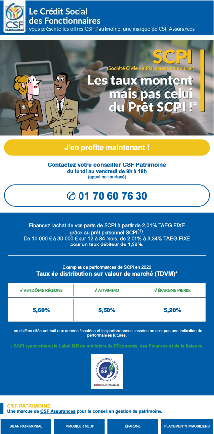 Le prêt personnel SCPI à partir de 2,01 %. Une opportunité à ne pas manquer ! C’est le message que nous avons adressé à nos prospects et adhérents dans l’enews CSF Patrimoine de mi-janvier.