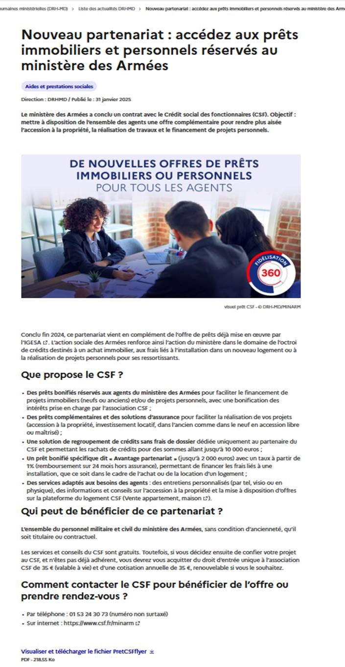 • le prêt Aide IMMO CSF réservé aux militaires, civils du ministère des Armées et gendarmes