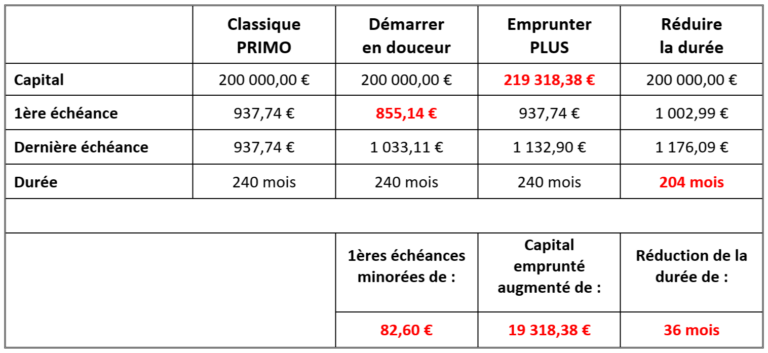 Comparons l’offre Classique PRIMO avec les différentes alternatives possibles pour un prêt de 200 K€ sur 20 ans au taux de 1,20 % :
