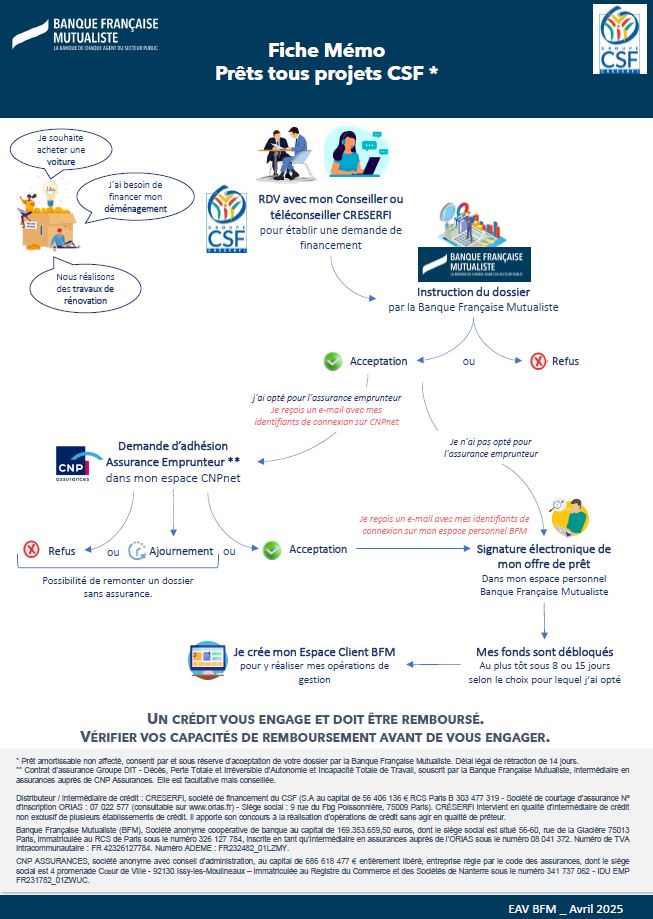 Ce mémo peut être remis à l’adhérent, avant ou pendant le RDV, et doit contribuer à rendre plus transparent et plus explicite le parcours d’instruction des prêts personnels avec notre partenaire BFM.