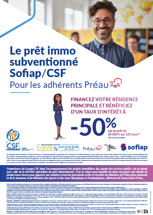 Ce prêt lancé en octobre en partenariat avec la SOFIAP s’adresse aux adhérents PREAU. Pour rappel, l’adhésion à PREAU est gratuite et possible pour tous les agents du ministère de l’Éducation nationale.
