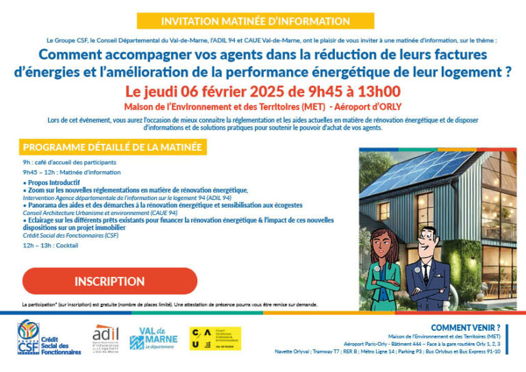 Le 6 février dernier, le CSF et l’ADIL 94 ont organisé une réunion d’information sur la rénovation énergétique à la Maison de l’Environnement de l’aéroport d’Orly. Cet événement, qui s’inscrit dans le cadre d’un partenariat entre les deux organismes, a rassemblé 80 participants issus de diverses fonctions publiques. L’objectif de cette matinée était de sensibiliser les fonctions RH aux enjeux de la rénovation énergétique et leur proposer des pistes d’accompagnement pour leurs collaborateurs.