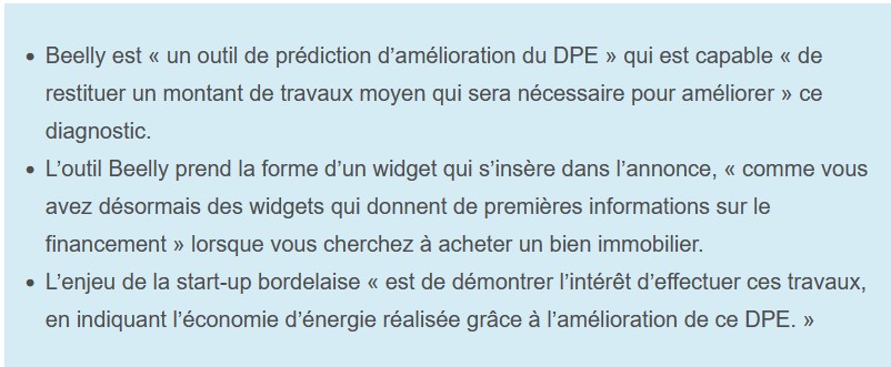 Beelly est « un outil de prédiction d’amélioration du DPE. » Concrètement, « cela veut dire qu’on lance des scénarios aléatoires de rénovation énergétique du bien immobilier à vendre, à l’issue desquels on sort un scénario moyen, qui permet de restituer un montant de travaux moyen qui sera nécessaire pour améliorer le DPE. On cherche systématiquement à atteindre un DPE D pour les appartements, et un C pour les maisons. » L’enjeu de la start-up bordelaise « est de démontrer l’intérêt d’effectuer ces travaux », en indiquant l’économie d’énergie réalisée grâce à l’amélioration de ce DPE. « Nous voulons montrer que c’est rentable d’effectuer ces travaux d’amélioration.»