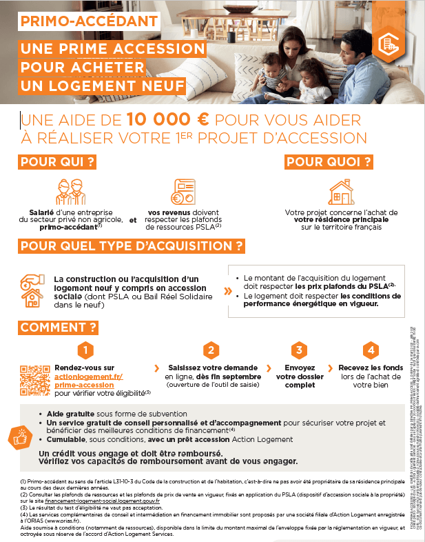 Action Logement propose une subvention d’un montant de 10 000€ pour faciliter l’accession à la propriété. Elle sera versée aux accédants sous réserve qu’ils remplissent certaines conditions :
